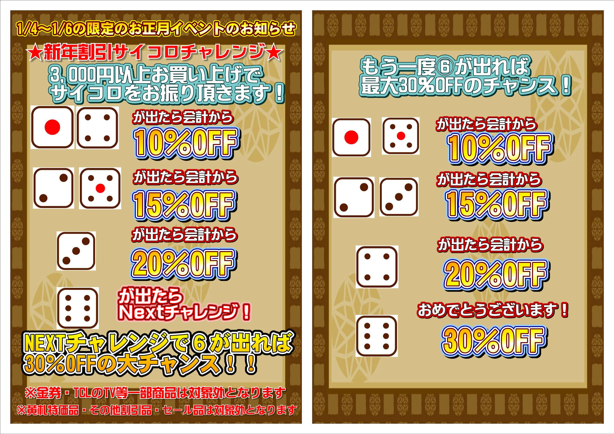 ハズレの目はございませんので、3,000円以上のお買い上げで必ず割引されるお得なイベントとなっております♪