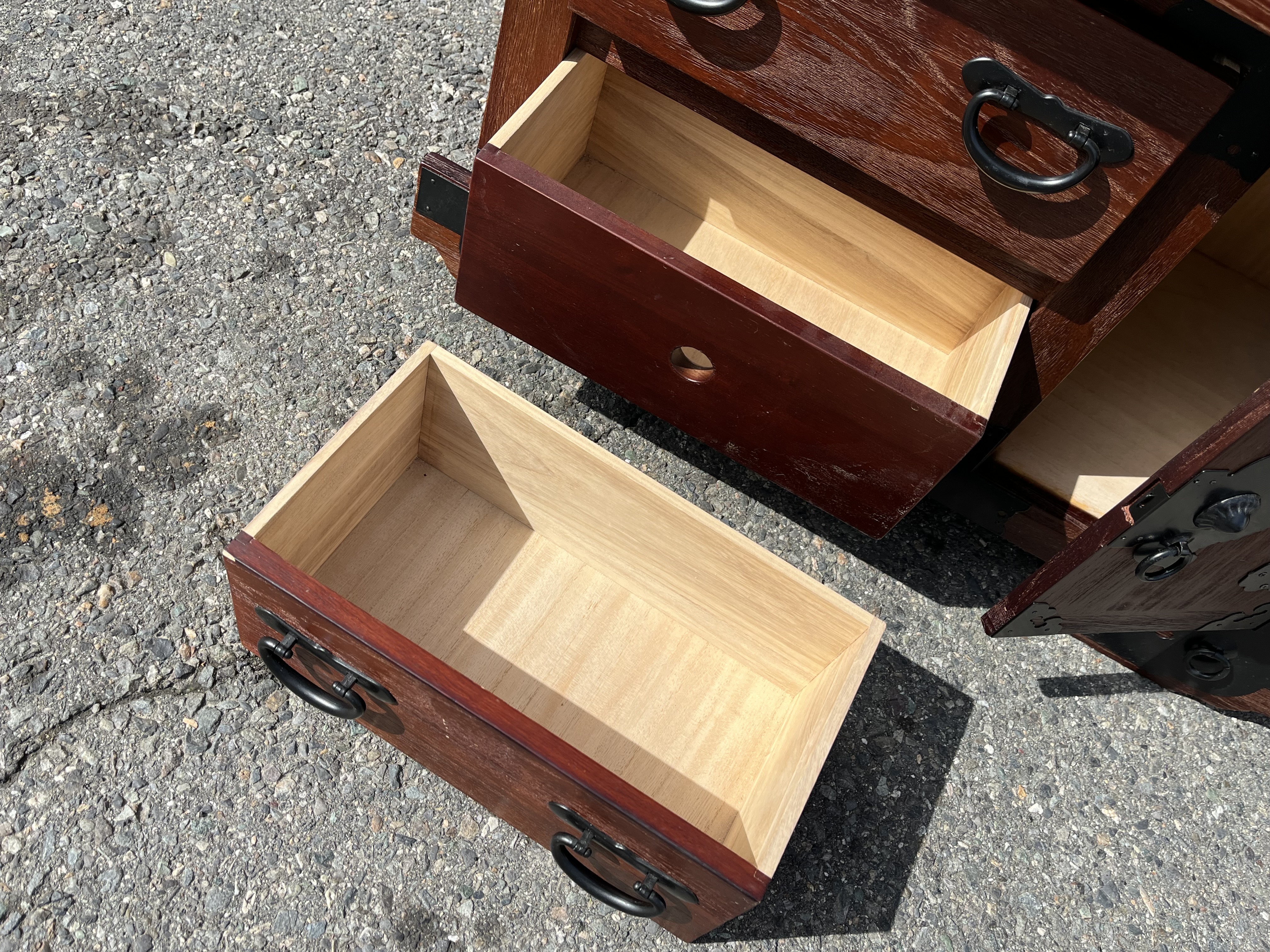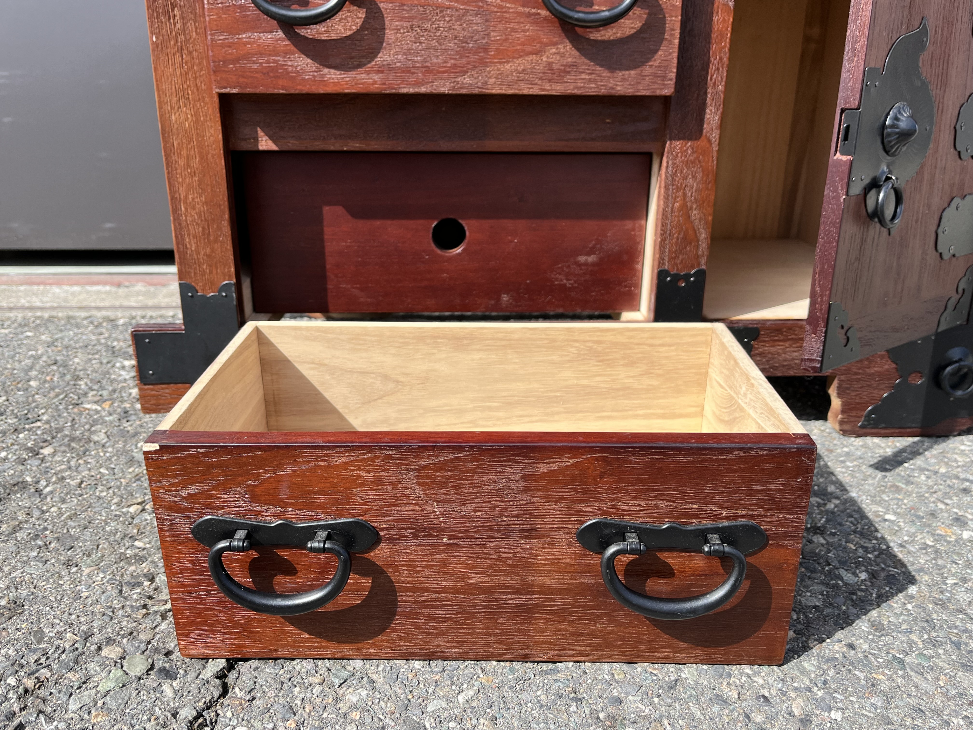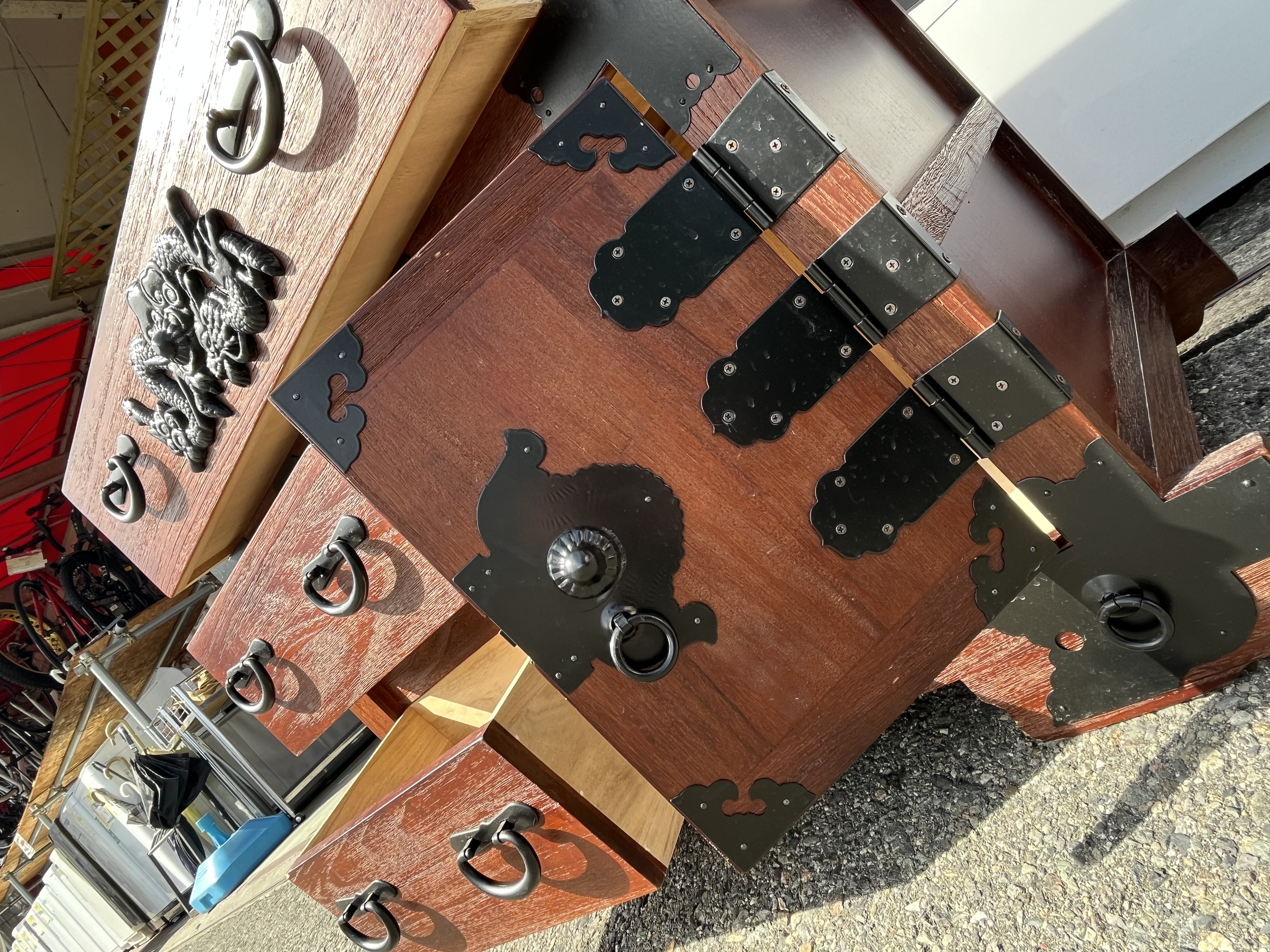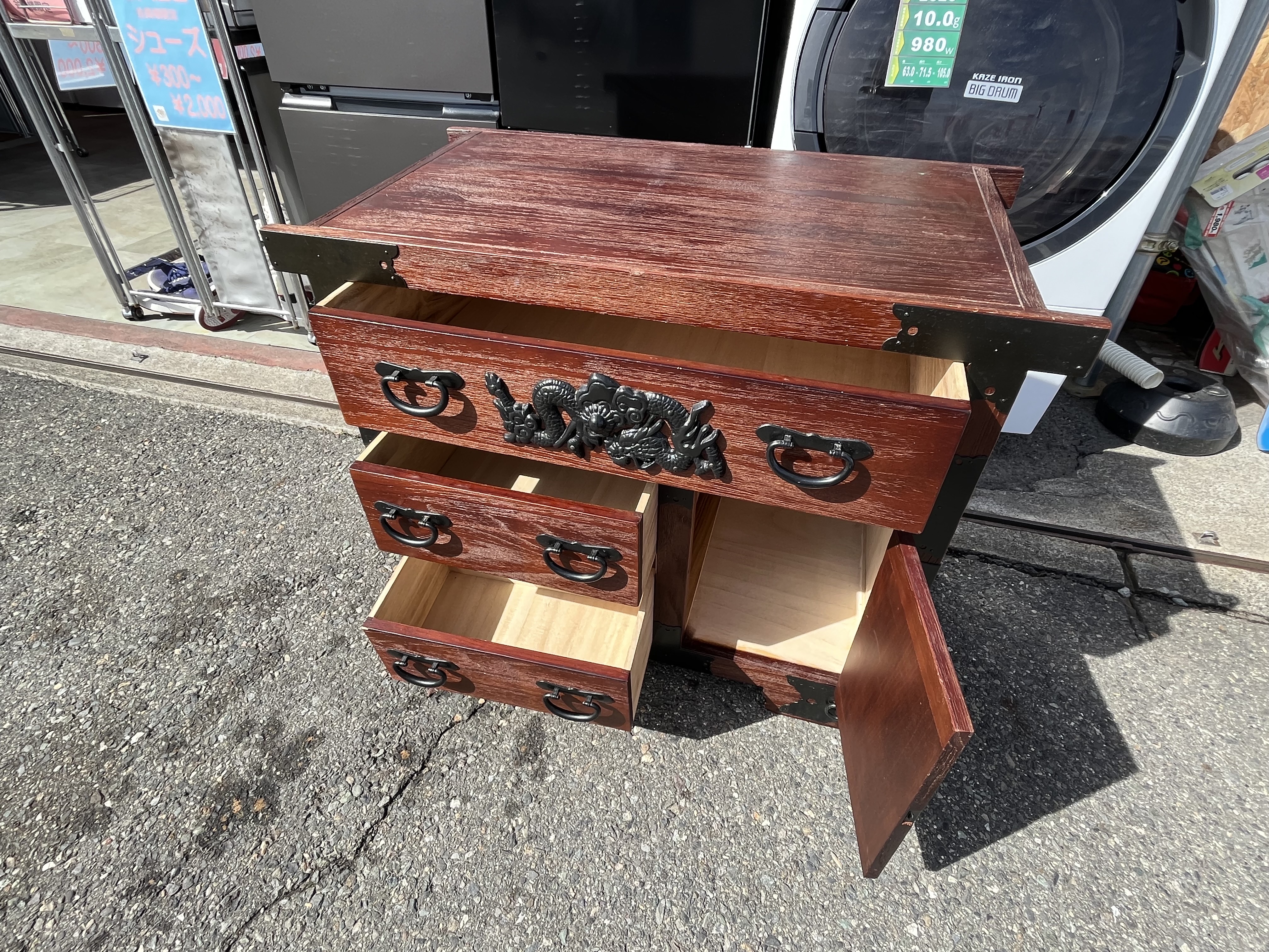今回お持ちいただいた雲龍文金具 民芸車箪笥 和箪笥 和家具 チェストです。実は隠し箱が有り、更に大きめの扉にはロックが掛かり、デザインも昔ながらのレトロなチェストです。